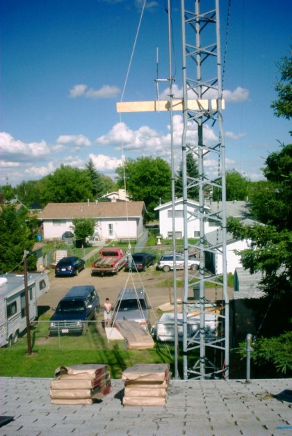 Summer of 2001 we decided we better put a new roof on the house, we decided to do it our self, Phillip our 4'th son was of a big help in this project. With my asthma I relized that carrying them bails of shingles up the ladder to the roof was not going to work well, I was right out of breath just unloading the pickup, so with a bit of brain scratching I rigged up with some rope, pullys, a board, and a scrap peice of plywood a elevator for hauling the shingles to the roof, the ham tower was a great help to support all this hardware, surpriseing what you can come up with when you scratch your brain! Just Phillipe my 13 year old and I hauled all the shingles up...